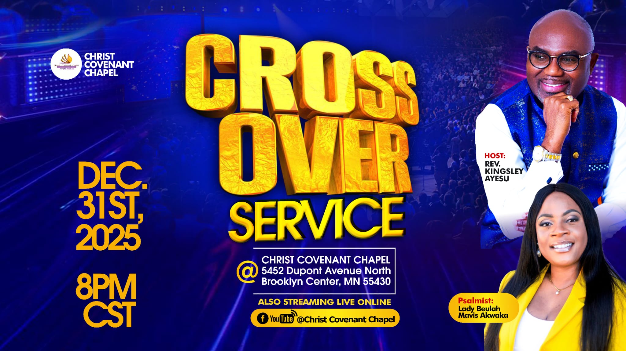 Church Service Sundays at 9:30 am CST Bible Studies Wednesdays at 7:00 pm CST Morning Glory Mondays at 5:00 am CST Prayer Service Fridays at 6:30 pm CST Half Night Service First Friday of the month at 8:00 pm CST
